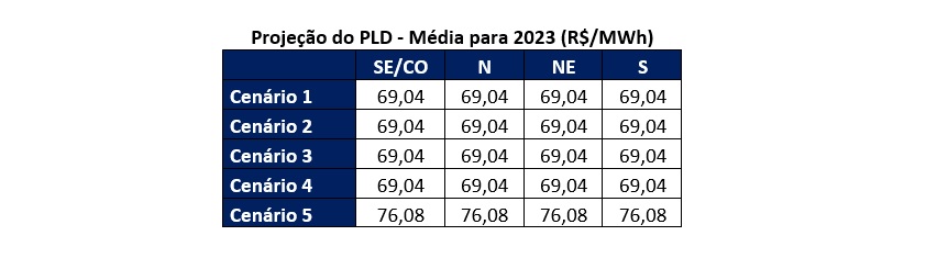 A Câmara de Comercialização de Energia Elétrica – CCEE projeta que o Preço de Liquidação das Diferenças para 2023 ficará próximo do seu valor mínimo. As estimativas divulgadas no último Encontro do PLD para a média do ano em cada um dos submercados pode ser observada abaixo, considerando cinco possíveis cenários climatológicos**: