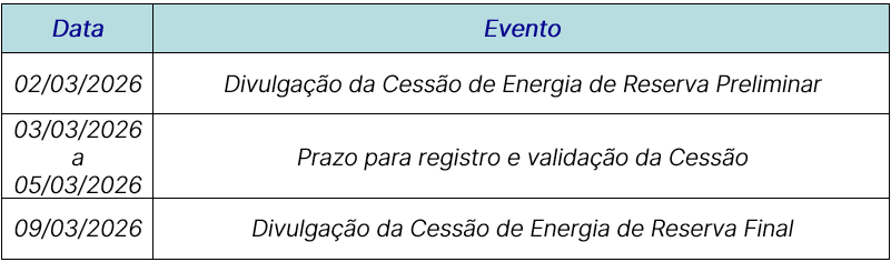 Está disponível o cronograma de eventos relativos à operacionalização do Mecanismo de Cessão de Energia de Reserva mensal de janeiro de 2026 para os 3º e 4º Leilões de Energia de Reserva.
