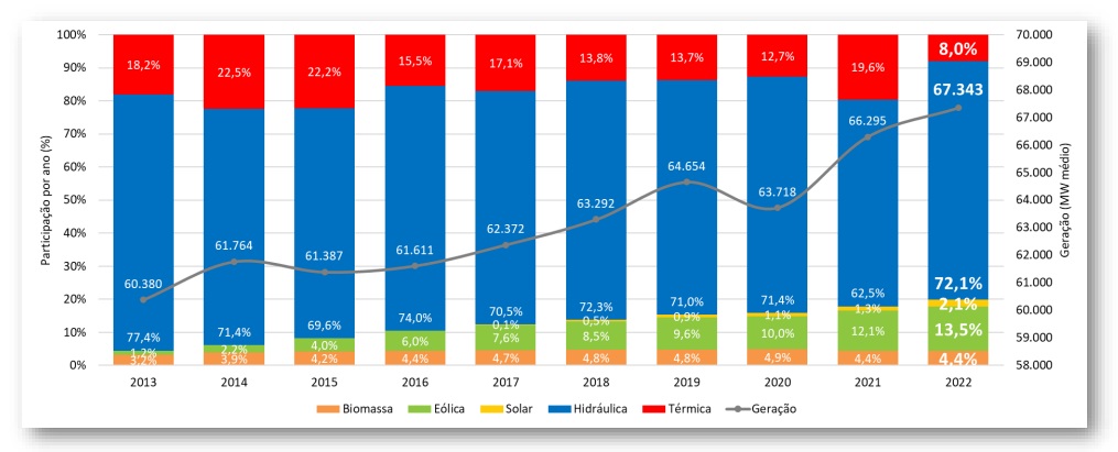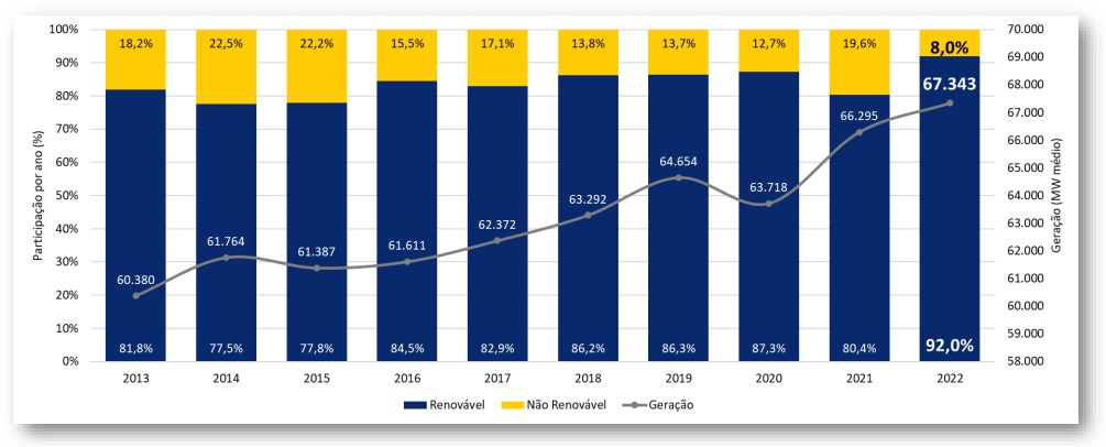 O ano de 2022 foi marcado pelo avanço da energia renovável no Brasil. O país ultrapassou o marco de 92% de participação de usinas hidrelétricas, eólicas, solares e de biomassa no total gerado pelo Sistema Interligado Nacional – SIN, o maior percentual dos últimos 10 anos.