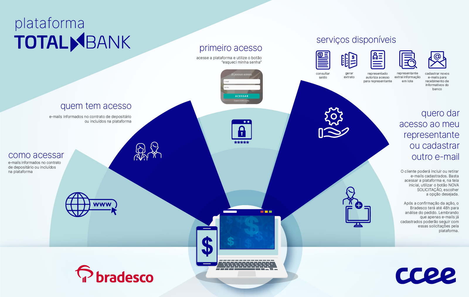 Disponibilizada pelo Bradesco em parceria com a Câmara de Comercialização de Energia Elétrica - CCEE, a plataforma Total Bank permite consultar saldo (exceto aplicações financeiras) da Conta Liquidação CCEE e gerar extratos. Os agentes representados podem autorizar que seus representantes acessem as suas informações. Já os representantes podem extrair os dados em lote.