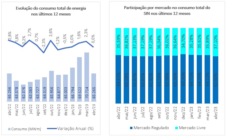 Depois de dois meses consecutivos de avanço, o Brasil encerrou abril com estabilidade no consumo de energia elétrica, com demanda de 65.265 megawatts médios, semelhante a registrada no mesmo período de 2022, segundo o Boletim InfoMercado Quinzenal da Câmara de Comercialização de Energia Elétrica – CCEE.