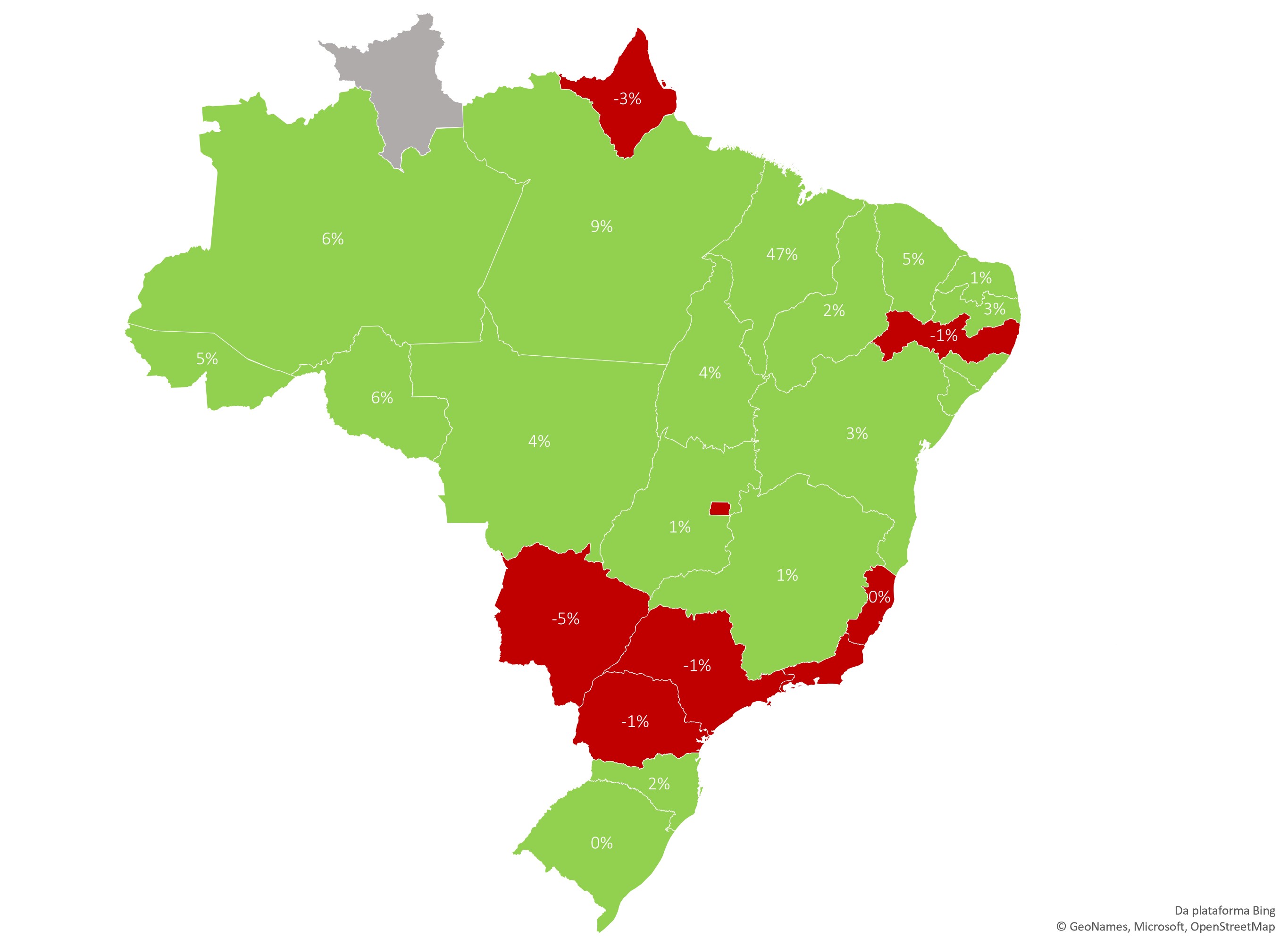 Na avaliação regional, as maiores altas ficaram concentradas nas regiões Norte e Nordeste, com destaque para o Maranhão e o Pará. Em ambos, o aumento reflete o consumo das indústrias metalúrgicas e fatores climáticos, sendo que, no caso maranhense, a alta expressiva é resultado também da retomada contínua da produção de uma importante planta do segmento de alumínios.