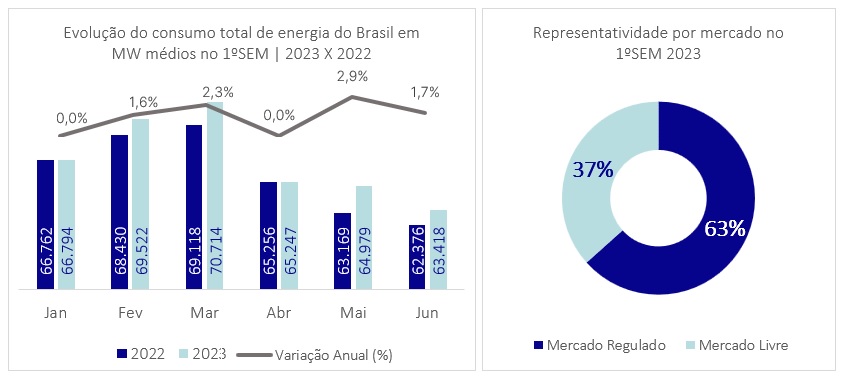 O Brasil consumiu 1,4% mais energia elétrica no primeiro semestre de 2023 do que no mesmo período do ano passado e alcançou a marca de 66.760 MW médios, segundo dados preliminares da Câmara de Comercialização de Energia Elétrica – CCEE. O avanço é resultado do bom momento para exportações da indústria mineradora e do crescimento das atividades do comércio e dos serviços, mesmo que as temperaturas mais amenas, sobretudo as registradas em janeiro e abril, tenham levado a uma menor demanda pela utilização de aparelhos de ar-condicionado.