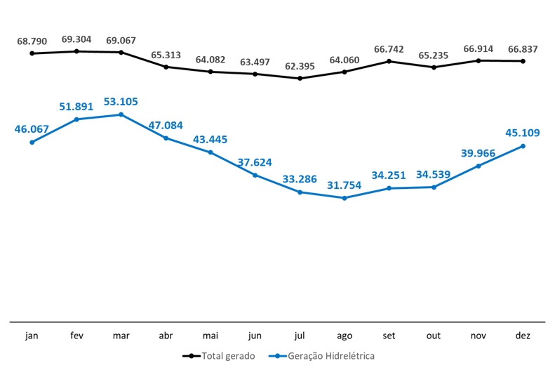 Afinal, você sabia que o Brasil produziu 65.997 MW médios de energia em 2021, sendo que as hidrelétricas, Pequenas Centrais Hidrelétricas (PCHs) e Centrais Geradoras Hidrelétricas (CGHs) foram responsáveis por 41.444 MW médios, ou seja, 62% do total gerado. Confira abaixo a geração hidráulica em 2021 comparada com a produção de energia mês a mês.