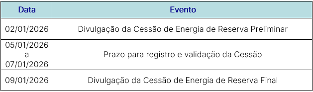960/25 - Publicado em: 19/12/25 18:26 hs | Atualizado em 19/12/25 18:31 hsEstá disponível o cronograma de eventos relativos à operacionalização do Mecanismo de Cessão de Energia de Reserva mensal de novembro de 2025 para os 3º e 4º Leilões de Energia de Reserva.