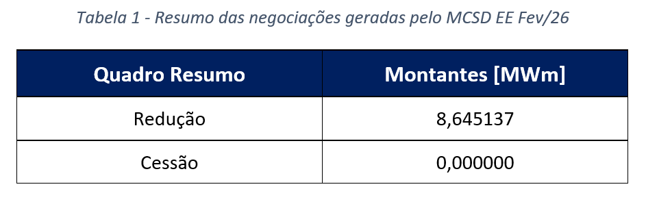 Foram disponibilizados, no Módulo MCSD Energia Existente do CliqCCEE, os relatórios referentes ao processamento do Mecanismo de Compensação de Sobras e Déficits de Energia Existente (MCSD EE) Mensal de fevereiro de 2026, em função do relatório de asseguração razoável emitido pela Ernst & Young Auditores Independentes.