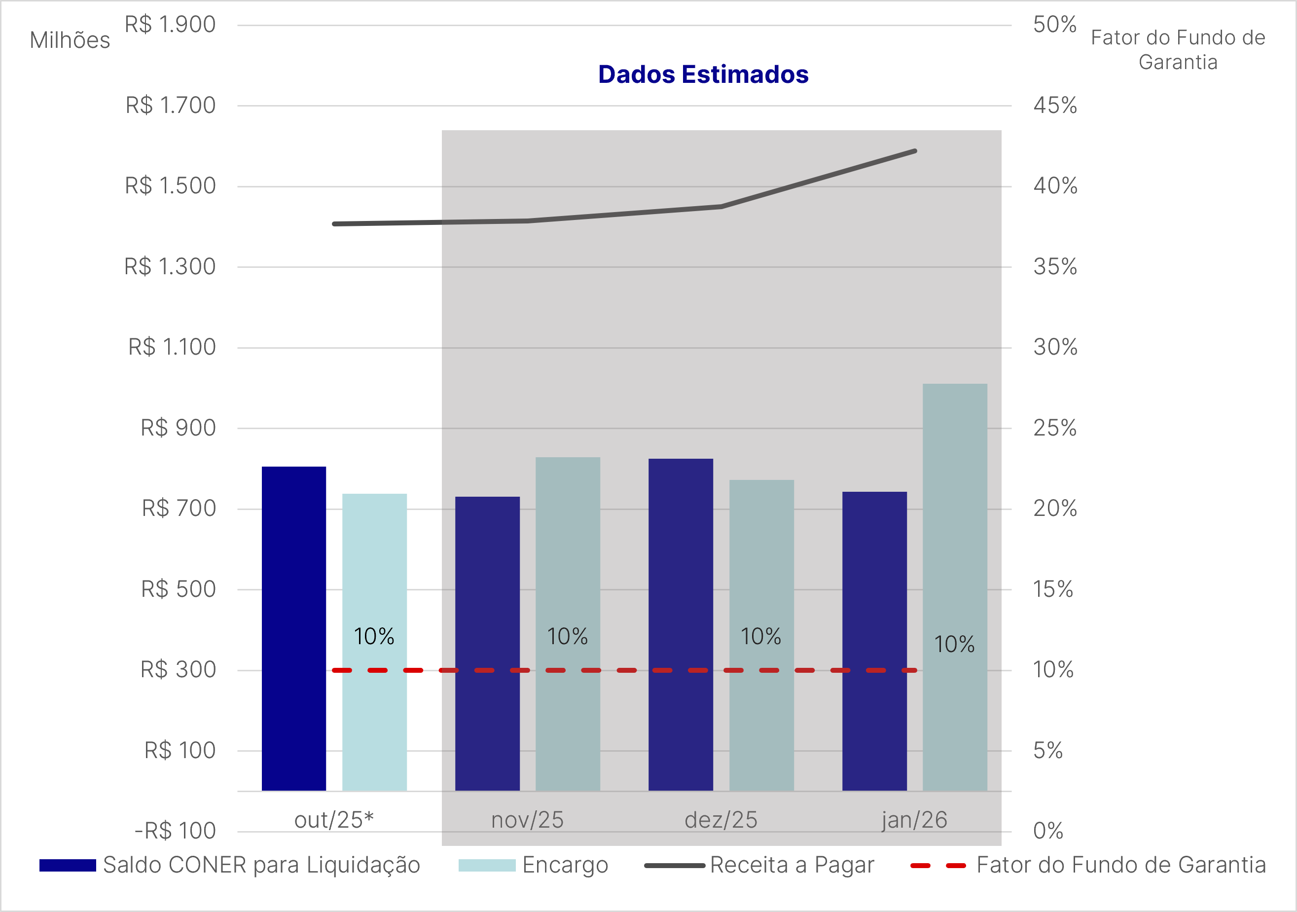 No gráfico e na tabela abaixo, seguem disponibilizados os resultados simulados. Por se tratar de previsão de recolhimento, os dados ainda poderão sofrer alterações, inclusive em função de eventuais deliberações no âmbito regulatório. De acordo com o cenário atual, estima-se que o EER entre outubro de 2025 e janeiro de 2026 seja de aproximadamente R$ 3,35 bilhões. Esta câmara informa, ainda, que, para o cálculo das previsões relativas ao Encargo de Energia de Reserva, foram considerados os valores decorrentes das penalidades estabelecidas no Relatório da Comissão de Solução Consensual, que resultou no Termo de Autocomposição para Execução do Contrato de Energia de Reserva nº 450/2021.
