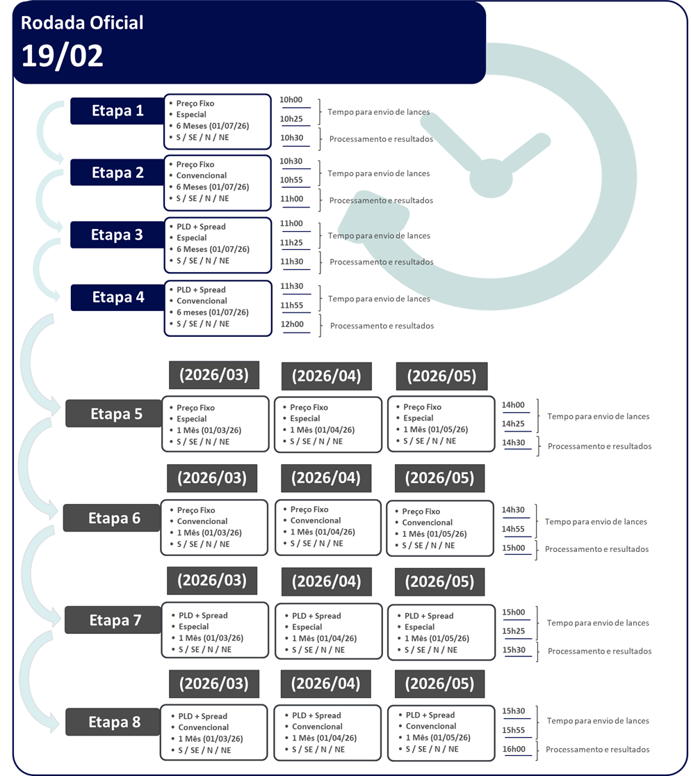 Adicionalmente, conforme informado no comunicado CO 076/26, as negociações serão realizadas em etapas. A Tabela 1 apresenta o encadeamento de execução e horários programados, bem como os produtos que cada uma irá ofertar.
