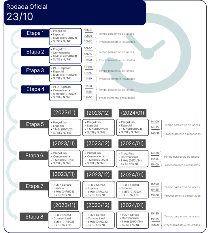 Adicionalmente, conforme informado no comunicado CO 757/23, as negociações serão realizadas em etapas. A Tabela 1 apresenta o encadeamento de execução e horários programados, bem como os produtos que cada uma irá ofertar.