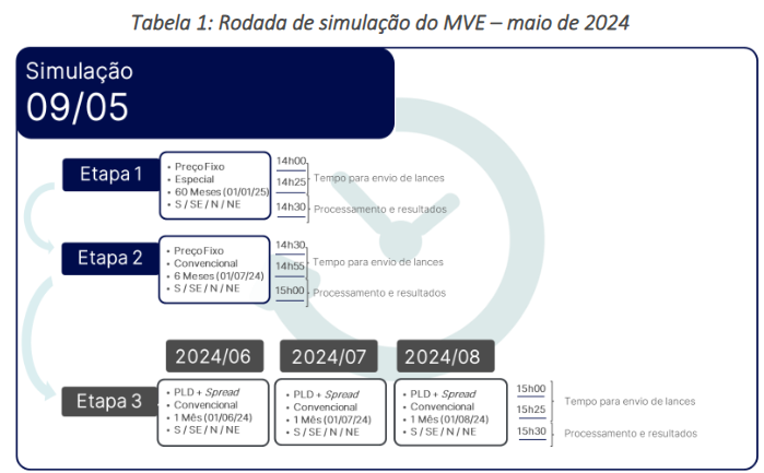 382/24 - Publicado em: 09/05/24 10:16 hs | Atualizado em 09/05/24 11:04 hsNesta quinta-feira (09), será realizada a rodada de simulação do Mecanismo de Venda de Excedentes (MVE) de maio de 2024, a partir das 14h. O evento tem a finalidade de preparar o mercado para o processamento oficial, que ocorre nos dias 14 e 15 de maio.