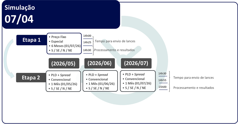 261/26 - Publicado em: 07/04/26 09:05 hs | Atualizado em 07/04/26 09:21 hsNesta terça-feira (7), será realizada a rodada de simulação do Mecanismo de Venda de Excedentes (MVE) de abril de 2026, a partir das 14h. O evento tem a finalidade de preparar o mercado para o processamento oficial, que ocorre no dia 15 de abril.