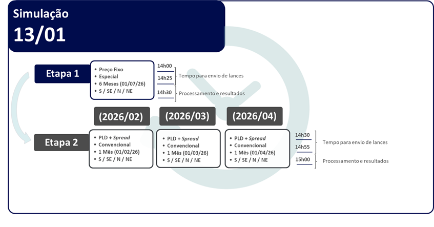 A CCEE reforça ainda a importância de os usuários (logins) que irão efetivamente submeter lances participarem da simulação, para fins de teste de acesso e validação de infraestrutura, de modo a assegurar uma operação sem intempéries no dia 21 de janeiro.