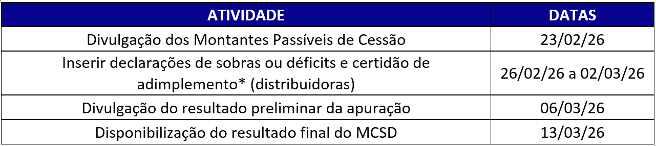 127/26 - Publicado em: 18/02/26 15:45 hs | Atualizado em 18/02/26 15:57 hsA Câmara de Comercialização de Energia Elétrica – CCEE - realizará, em março de 2026, o Mecanismo de Compensação de Sobras e Déficits - MCSD de Energia Nova na modalidade A-N, para os processamentos A-1, A-2, A-3, A-4, A-5, A-6 e A-7, conforme informado no CO 124/26, e em consonância com as Regras de Comercialização e com a regulação vigente.