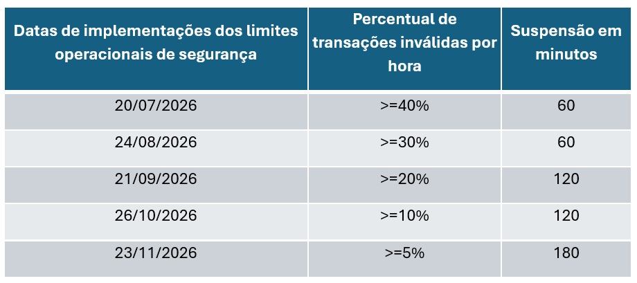 Deste modo, a partir de 20 de julho de 2026, a Plataforma de Integração terá regras de uso para evitar estes comportamentos. Os limites operacionais de segurança estabelecerão percentuais aceitáveis de falhas em total de transações por hora. Caso ultrapassem esses limites, os acessos serão suspensos temporariamente para a origem de endereçamento IP (Internet Protocol), ou seja, qualquer acesso do equipamento ofensor a todos os serviços da plataforma seão interrompidos.