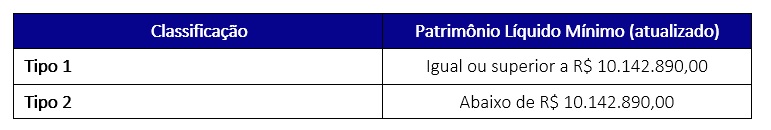 Serão aceitos os balanços referentes ao ano de 2022 ou atualizações do exercício de 2023, desde que estejam auditados por empresas autorizadas pela Comissão de Valores Mobiliários – CVM. Assim como preconiza a Resolução, a CCEE usará o Patrimônio Líquido verificado para a tipificação, conforme tabela abaixo: