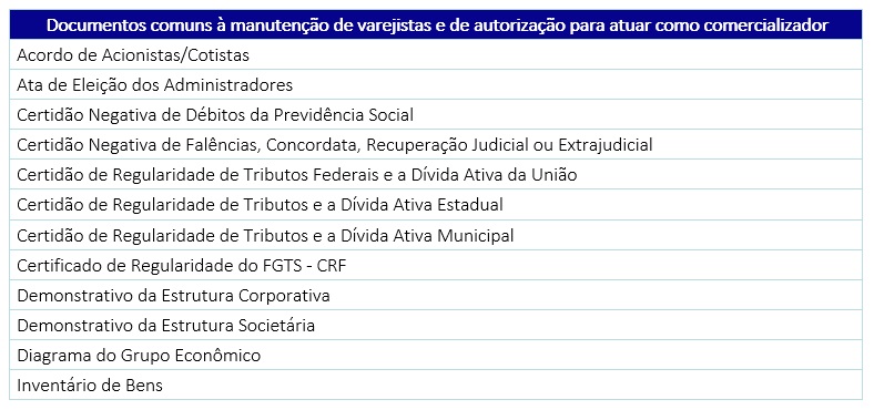 Com a mudança, os procedimentos de manutenção das habilitações varejistas e da autorização dos agentes que atuam como comercializadores devem acontecer em paralelo. Como parte da documentação requerida para ambos é idêntica, será possível solicitar a dispensa do envio, em somente um dos processos, dos comprovantes abaixo: