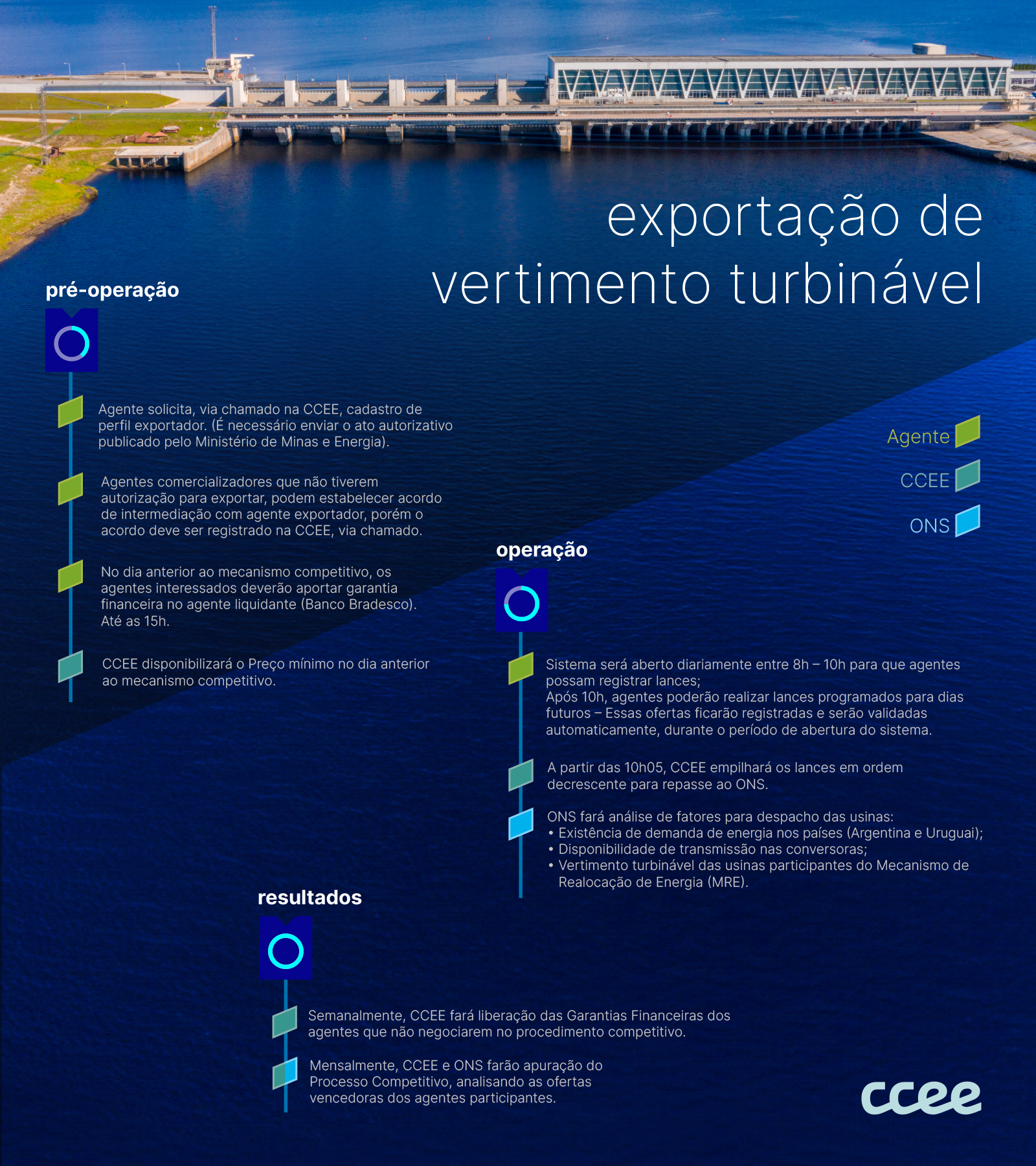 O processo de negociação de Exportação de Vertimento Turbinável (EVT) ocorre diariamente. Os agentes comercializadores elegíveis à participação no processo competitivo deverão declarar sua oferta em MW por hora para atendimento à demanda dos países supramencionados, assim como o preço correspondente para a oferta. Os agentes poderão, durante a janela de lances, inserir ofertas para o dia seguinte e/ou períodos futuros.