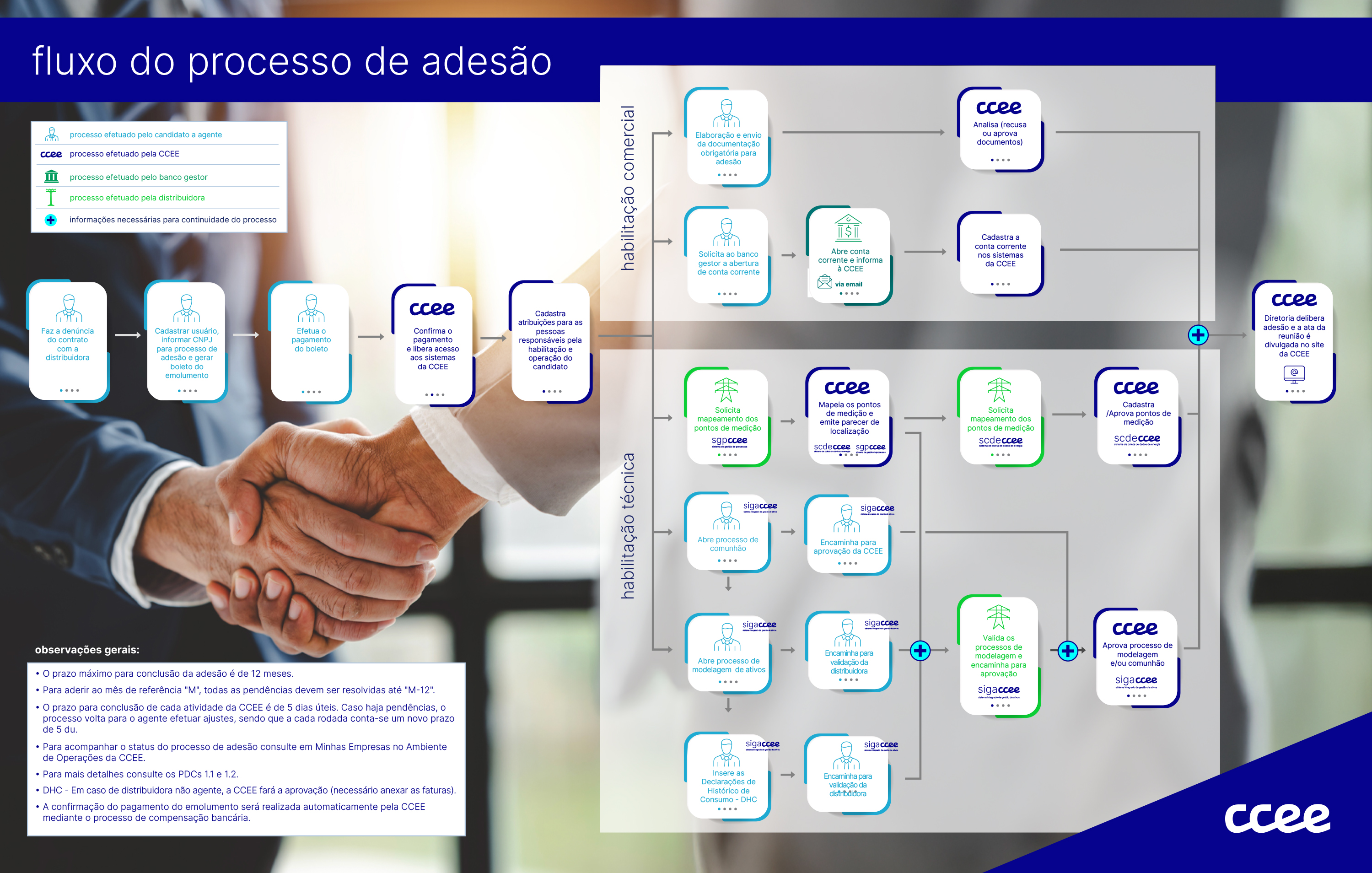 O primeiro passo para participar do mercado de energia é abrir o processo de adesão na Câmara de Comercialização de Energia Elétrica. O candidato à agente deve realizar um cadastro no ambiente de operações e efetuar o pagamento do emolumento para iniciar a habilitação comercial e técnica.