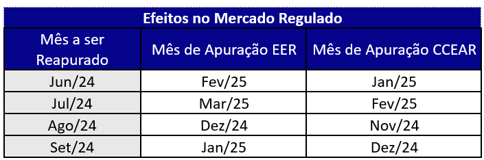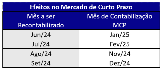 Diante disso, a partir da contabilização de novembro de 2024, os reprocessamentos do Mercado de Curto Prazo, Energia de Reserva e Receita de Venda de CCEAR serão realizados conforme cronograma abaixo: