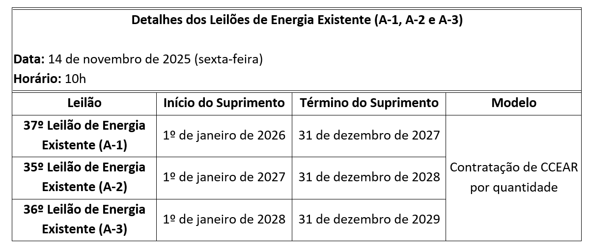 Será negociada a energia de empreendimentos de qualquer fonte (hídrica, solar, eólica ou térmica), e firmados Contratos de Comercialização de Energia no Ambiente Regulado (CCEARs) na modalidade quantidade de energia.