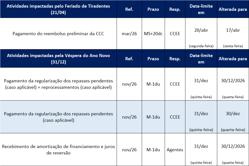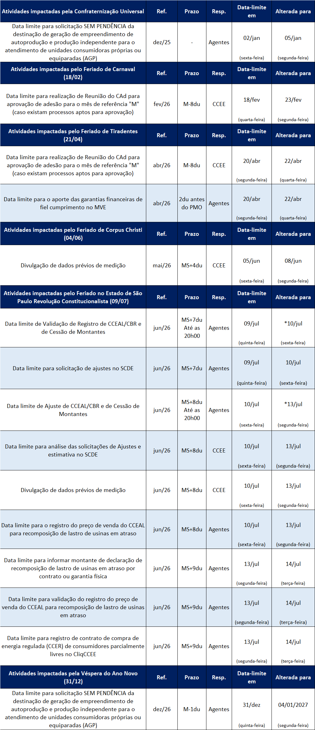 Em conformidade com o submódulo dos Procedimentos de Comercialização (PdCs) 1.4 – Atendimento e com a finalidade de não causar prejuízo às operações do mercado, a CCEE alterou as datas-limite das seguintes atividades coincidentes com períodos festivos, de acordo com as tabelas abaixo: