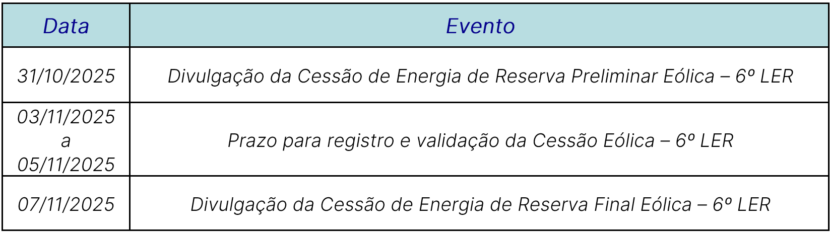 CO – cronograma da cessão de energia de reserva quadrienal para fonte eólica do 6º LER - set/25