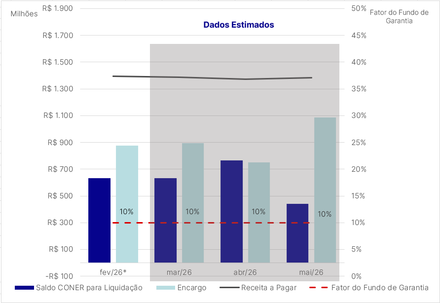 No gráfico e na tabela abaixo, seguem disponibilizados os resultados simulados. Por se tratar de previsão de recolhimento, os dados ainda poderão sofrer alterações, inclusive em função de eventuais deliberações no âmbito regulatório. De acordo com o cenário atual, estima-se que o EER entre fevereiro de 2026 e maio de 2026 seja de aproximadamente R$ 3,61 bilhões. Esta câmara informa, ainda, que, para o cálculo das previsões relativas ao Encargo de Energia de Reserva, foram considerados os valores decorrentes das penalidades estabelecidas no Relatório da Comissão de Solução Consensual, que resultou no Termo de Autocomposição para Execução do Contrato de Energia de Reserva nº 450/2021.