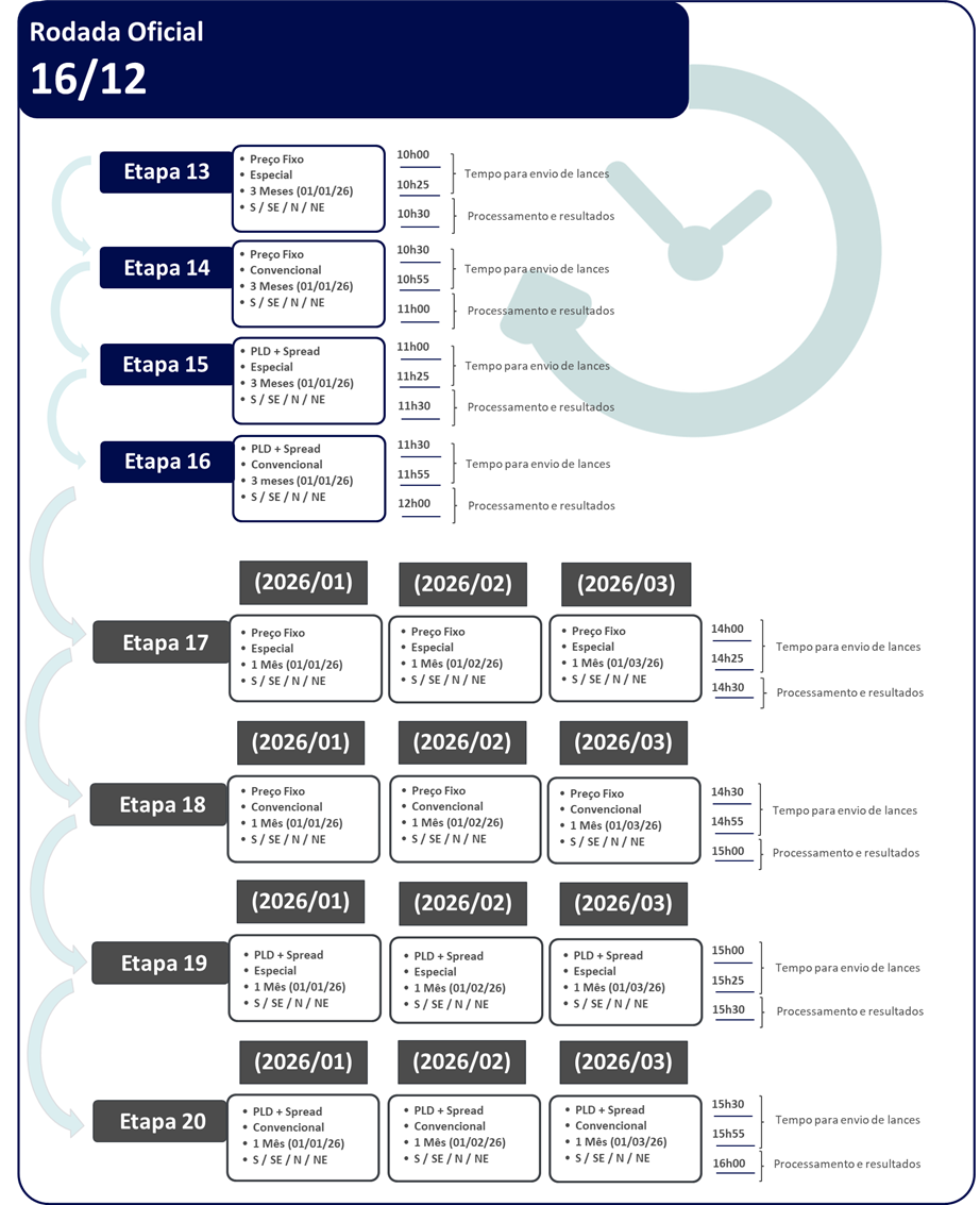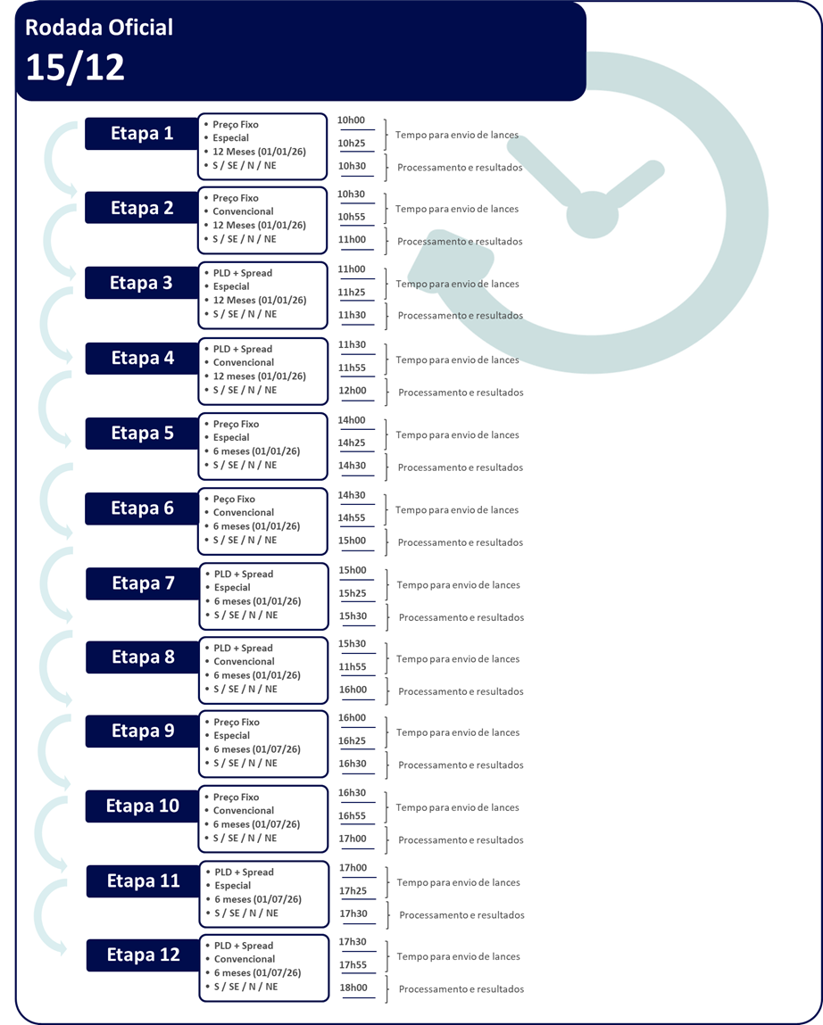 932/25 - Publicado em: 15/12/25 08:37 hs | Atualizado em 15/12/25 08:50 hsNesta segunda e terça-feira (15 e 16/12), a partir das 10h, será realizada a rodada de negociações do Mecanismo de Venda de Excedentes (MVE) de 2025, ofertando produtos vigência de 1 mês, válidos a partir de janeiro, fevereiro e março de 2026, produtos com vigência de 3 meses, válidos a partir de janeiro de 2026, produtos com vigência de 6 meses, válidos a partir de janeiro a junho de 2026 e de julho a dezembro de 2026, e produtos com vigência de 12 meses, válidos a partir de janeiro de 2026.