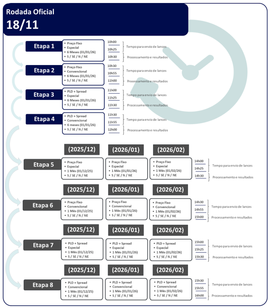 Nesta terça – feira (18/11), a partir das 10h, será realizada a rodada de negociações do Mecanismo de Venda de Excedentes (MVE) de 2025, ofertando produtos com vigência de 1 mês, válidos a partir de dezembro de 2025 e janeiro e fevereiro de 2026 e produtos com vigência de 6 meses, válidos a partir de janeiro de 2026.