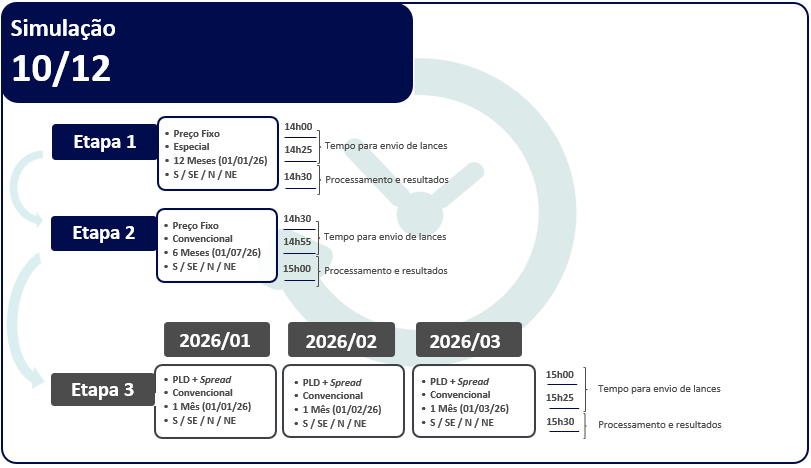 A CCEE reforça ainda a importância de os usuários (logins) que irão efetivamente submeter lances participarem da simulação, para fins de teste de acesso e validação de infraestrutura, de modo a assegurar uma operação sem intempéries nos dias 15 e 16 de dezembro.