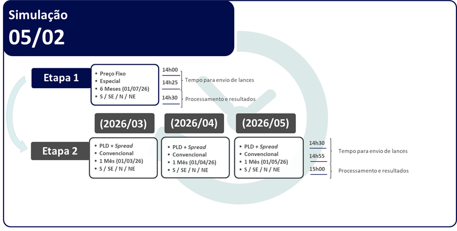 Nesta quinta-feira (5), será realizada a rodada de simulação do Mecanismo de Venda de Excedentes (MVE) de fevereiro de 2026, a partir das 14h. O evento tem a finalidade de preparar o mercado para o processamento oficial, que ocorre no dia 19 de fevereiro.