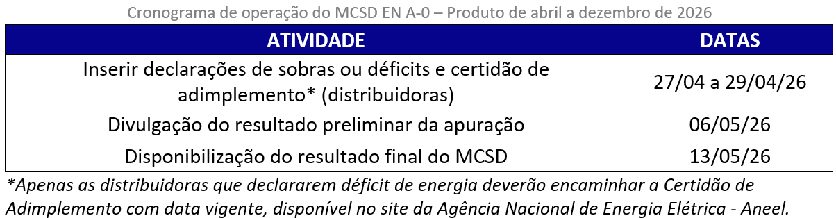 318/26 - Publicado em: 27/04/26 09:17 hs | Atualizado em 27/04/26 09:22 hsOs agentes interessados em participar do Mecanismo de Compensação de Sobras e Déficits (MCSD) de Energia Nova na modalidade A-0 de abril de 2026, poderão informar as declarações de sobras e déficits no CliqCCEE no período de 27/04/26 a 29/04/26, conforme cronograma e informações divulgados no CO 296/26.