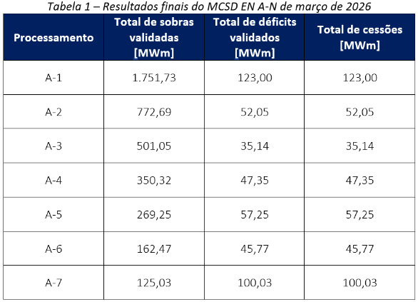 Estão disponíveis os resultados finais do Mecanismo de Compensação de Sobras e Déficits (MCSD) de Energia Nova na modalidade A-N de março de 2026, referentes aos processamentos A-1, A-2, A-3, A-4, A-5, A-6 e A-7 em função do relatório de asseguração emitido pela Ernst & Young Auditores Independentes.